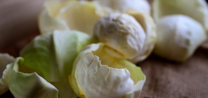2 Zwiebeln, ca. ein halbes Kilo Weißkraut, ½ TL Kümmel gemahlen, ½ TL Bohnenkraut, ½ TL Rosmarin, Salz und ordentlich Pfeffer, 2 EL Olivenöl
