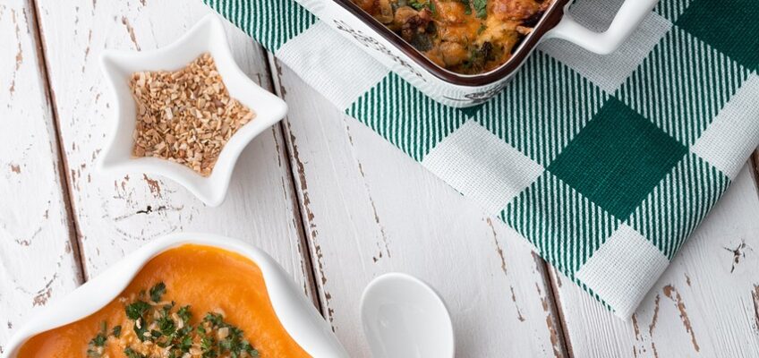 1 große Süßkartoffel, 5 cm Lauchstange, 1 EL Ghee oder Olivenöl, 1,5 TL Orientgewürz oder Madras Curry, 5 Stück getrocknete Paradeiser, 2 EL Grieß, 1 EL Flohsamen gemahlen, 1/8 l Wasser, 1 TL Steinsalz, Pfeffer, 1 TL Oregano oder Majoran oder Bohnenkraut Gemüse waschen, fein schneiden oder reiben. In der Pfanne Ghee oder Öl erhitzen, Sambar Masala (enthält alle Geschmacksrichtungen außer salzig) anrösten, Geschnittenes Gemüse kurz mit rösten, geschnittene Tomaten, Grieß und Flohsamen untermengen, Mit Wasser aufgießen, salzen/pfeffern nach Bedarf und 5 Minuten köcheln lassen, Majoran/Oregano/Bohnenkraut und Pfeffer zugeben, Eine Auflaufform mit Ghee oder Öl bepinseln, das Gemüse in die Form geben, Im Rohr bei 175° 15 Minuten überbacken.
