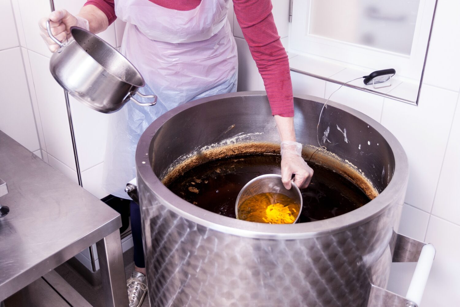 Ganz anders beim Ghee von Somamed: Für seine Herstellung köchelt feinste österreichische Bio-Sauerrahmbutter MINDESTENS 20 Stunden vor sich hin. Das aufschäumende Eiweis wird dabei händich abgeschöpft bzw. setzt es sich am Boden des sehr großen Kochtopfs ab. Dann wird es – händisch – 3 mal gefiltert. Das verbleibende, wirklich reine Butterfett – wird wieder händisch – abgefüllt. Während des gesamten Ablaufs lauscht es vedischer Musik :)